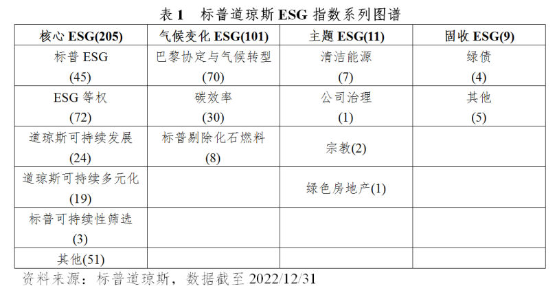截至2022年末,標普ESG指數已覆蓋股票、債券、REITs資產(chǎn),數量超過(guò)300只。其中,氣候轉型、碳效率、碳成本風(fēng)險是標普ESG指數近年來(lái)關(guān)注的重點(diǎn)。目前,標普ESG指數共計分為四類(lèi):核心ESG、氣候變化ESG、主題ESG和固收ESG。其中核心ESG指數數量最多,該系列基于ESG評分高低進(jìn)行選樣,其中標普ESG系列以主流標普指數為基礎,在ESG評分篩選的同時(shí)保留基準指數的行業(yè)權重;ESG等權系列將達至特定評分門(mén)檻之上的證券都納入其中并采用等權重策略。
