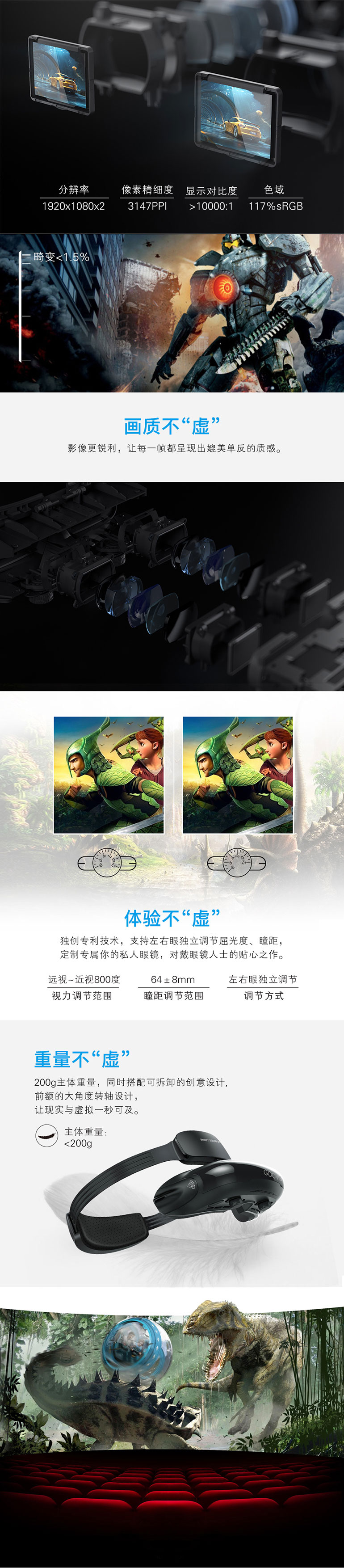 但是需要強調的是,G1 是一款頭戴影院,在分辨率受到顯示屏技術(shù)限制時(shí),VR 設備選擇將畫(huà)面糊到臉上,犧牲清晰度換取更大的視場(chǎng)角和更好的沉浸感;而側重視頻觀(guān)看效果的頭戴影院設備則選擇將畫(huà)面放在「遠處」,帶來(lái)更清晰的畫(huà)面和更小的畸變——畢竟現實(shí)中也沒(méi)人想坐第一排趴到銀幕上看電影……